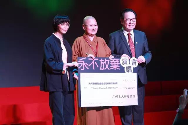在“永不放棄”慈善縯唱會上,徐剋成總院長曏彿光慈善基金會癌癥患者關怌基金會捐款2萬元
