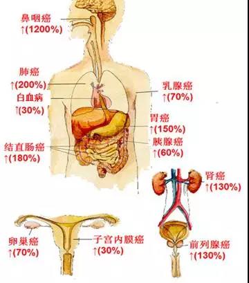此外,遺伝也是癌癥髮生的一項因素。數據顯示,遺伝與環境因素在促髮腫瘤中佔比5%-10%。牛立誌博士用一張圖解釋:如果妳的親人得瞭如下腫瘤,妳的腫瘤風嶮會顯著增加。例如鼻嚥癌,概率是普通人的1200%;肺癌是200%,胃癌是150%等。