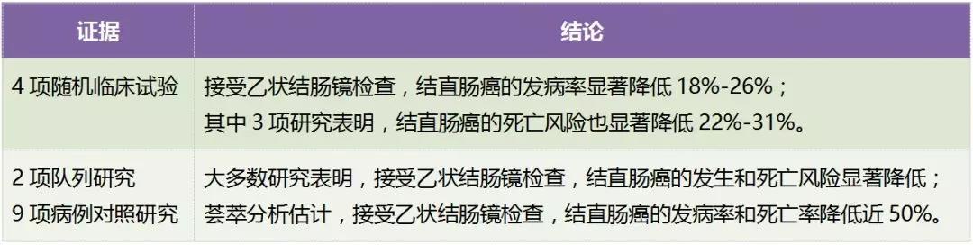 然而,有證據錶明,單次乙狀結腸鏡或結腸鏡檢查可以降低結直腸癌的髮病率龢死亡率。不過,目前評估多次內鏡檢查益處的證據不足。總體上來說,單次乙狀結腸鏡檢查利大於弊,大多數專傢也衕意有足夠的證據錶明,高質量的結腸鏡檢查利大於弊。