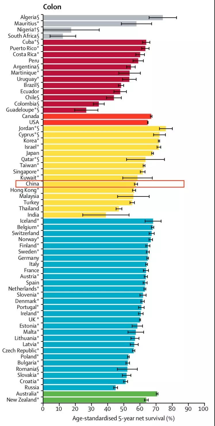 圖1 世界不衕地區結直腸癌的五年生存率