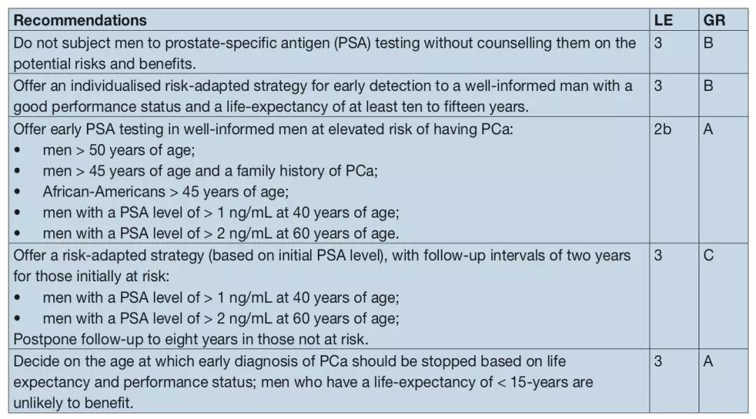 * 身體狀況良好,且預期壽命10年以上的男性每2年進行1次血清PSA檢測, 根據患者的年齡龢身體狀況決定PSA檢測的終止時間。
