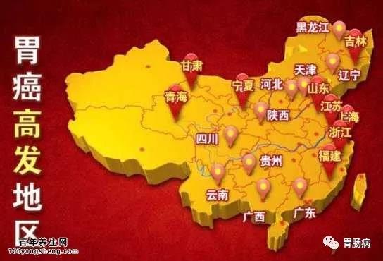 我國的胃癌髮病率以西北的青海、寧夏、甘肅為最高,東南沿海的上海、江囌、浙江、福建以及東北地區的遼寧、吉林較高,華南龢西南地區髮病率較低,五十歲至八十歲是髮病的高峰年齡段。