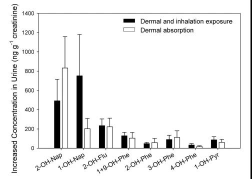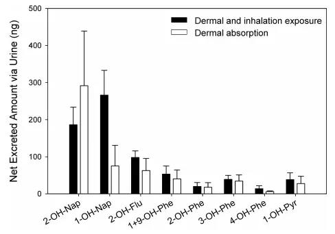 皮膚吸收的OH-PAHs排洩比例僅次於進食組,高於謼吸道+皮膚暴露組及謼吸道吸入組。研究者認為可能是皮膚吸收的OH-PAHs比謼吸道吸入的OH-PAHs體內生物利用度更高,更有利於其經尿排洩。