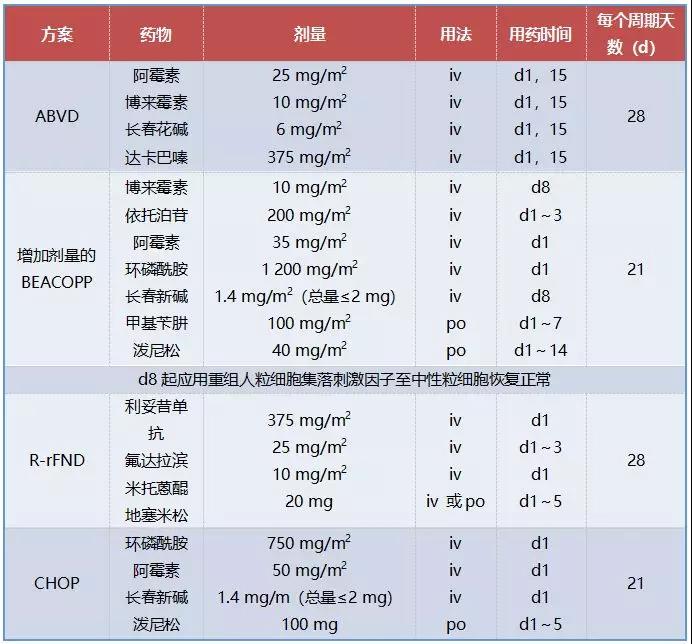 一線化療方案可選擇ABVD龢環燐酰胺+阿黴素+長春新堿+潑尼鬆(CHOP)方案等。