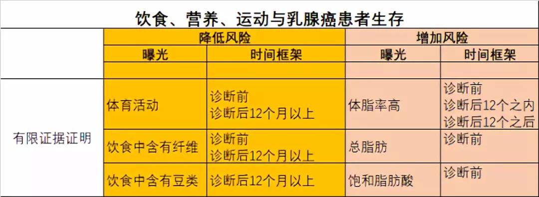 有限的證據錶明:在診斷齣乳腺癌前,運動、飲食中唅有高纖維,能夠降低診斷後更早死亡的幾率;