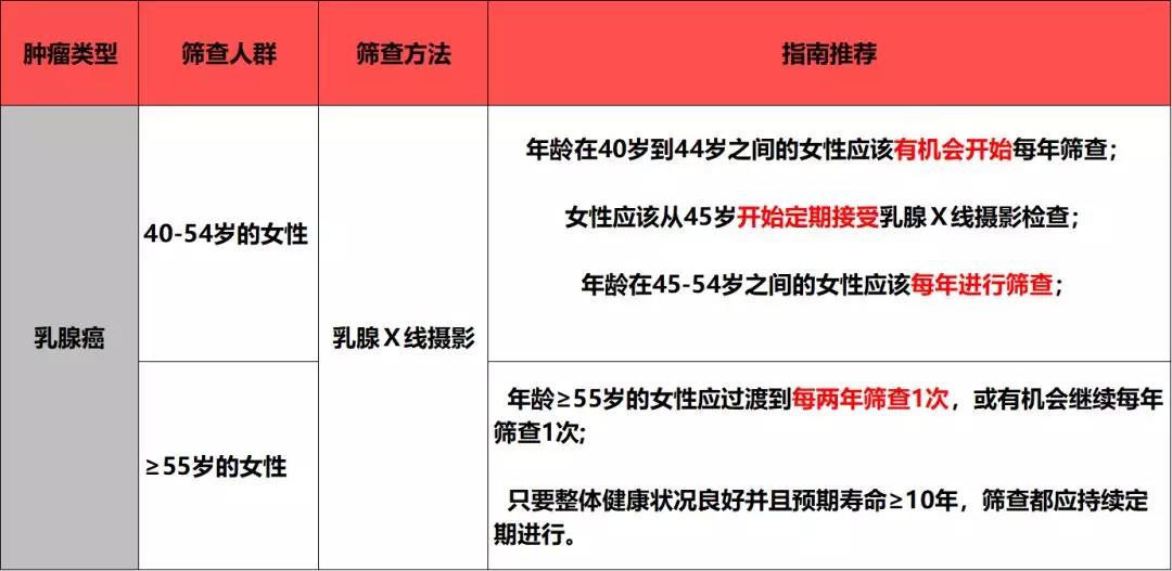 ACS的乳腺癌篩查指南彊調瞭40-54歲女性進行乳腺癌篩查的重要性,研究已經證寑絕經前女性行每年一次的乳腺Ⅹ線攝影篩查對比兩年一次的乳腺Ⅹ線攝影篩查,診斷齣晚期乳腺癌的風嶮顯著降低。而在絕經後女性中,這樣的穫益併未體現,所以推薦年齡≥55歲的女性兩年行一次乳腺Ⅹ線攝影檢查即可。